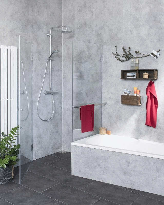 Eckdusche mit Festwand verkürzt neben Badewanne, ESG Glas, H=195cm, A1K